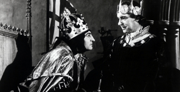 Olivier divides the scene of wooing Lady Anne in two. When it begins, he comes on screen yelling, pulls his sword, not at all like McKellen’s Richard who enters suave, respectful of the dead, though smoothly cunning. This Richard enters offensively, and one thinks “well, he’ll never woo Anne in this fashion, it’s impossible he’ll interrupt the procession and then get her into bed two minutes after.” Well, he doesn’t. And that’s the brilliant bit. Now he says the “I’ll have her, but I won’t keep her long” and we wonder what’s he planning? He follows this by getting Clarence incarcerated, and only afterwards do we see Lady Anne alone and mourning, her husband’s body now interned within his tomb, so that the body is no longer something to poke at and remind us of Richard’s cruelties. Now that the scene is peaceful, Richard enters quietly, and you can see, it’s almost too much to bear, it’s so subtle, it’s so sexy, Anne falls for Richard. Now, never in my mind has this been the case, I always thought of Richard as sort of backing Anne quite in the corner, quietly working that she’ll either marry him or get used to not living much the courtly lifestyle anymore. I assumed. “To take is not to give” always settled my mind as to her opinions, that she has but one direction to face. No, she falls enraptured here, she speaks her angry words in sweet whispers, while Richard draws kisses out of her, but refuses to accept them, until finally she ends the scene with her own passionate advance, and then into the bedchamber, finis finis! Whether purists find this purely offensive, I do not know, and generally I find such changes in rather poor taste, but this, perhaps only in the medium of film, works very well for me.