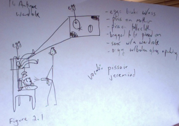 Indeed, I use an asterisk for assholes, and a coffeebean for vaginas. The first thing one realizes is that this is a very difficult section of the body to draw. The geography is simply confounding. But, as the chapter begins, “that was the period when Simone developed a mania for breaking eggs with her ass,” we’re pretty much forced to come to terms with precisely how she pulls this off (particularly if we’ve read the book before). So, there you have it. Also, a list of things that go on in this chapter: eggs broke with ass, piss on mother (accident), piss on tablecloth (on purpose), begging to be pissed on (during seizure), sex with a wardrobe (inside is locked another girl, masturbating), and an orgy of teens with broken glass and puking.